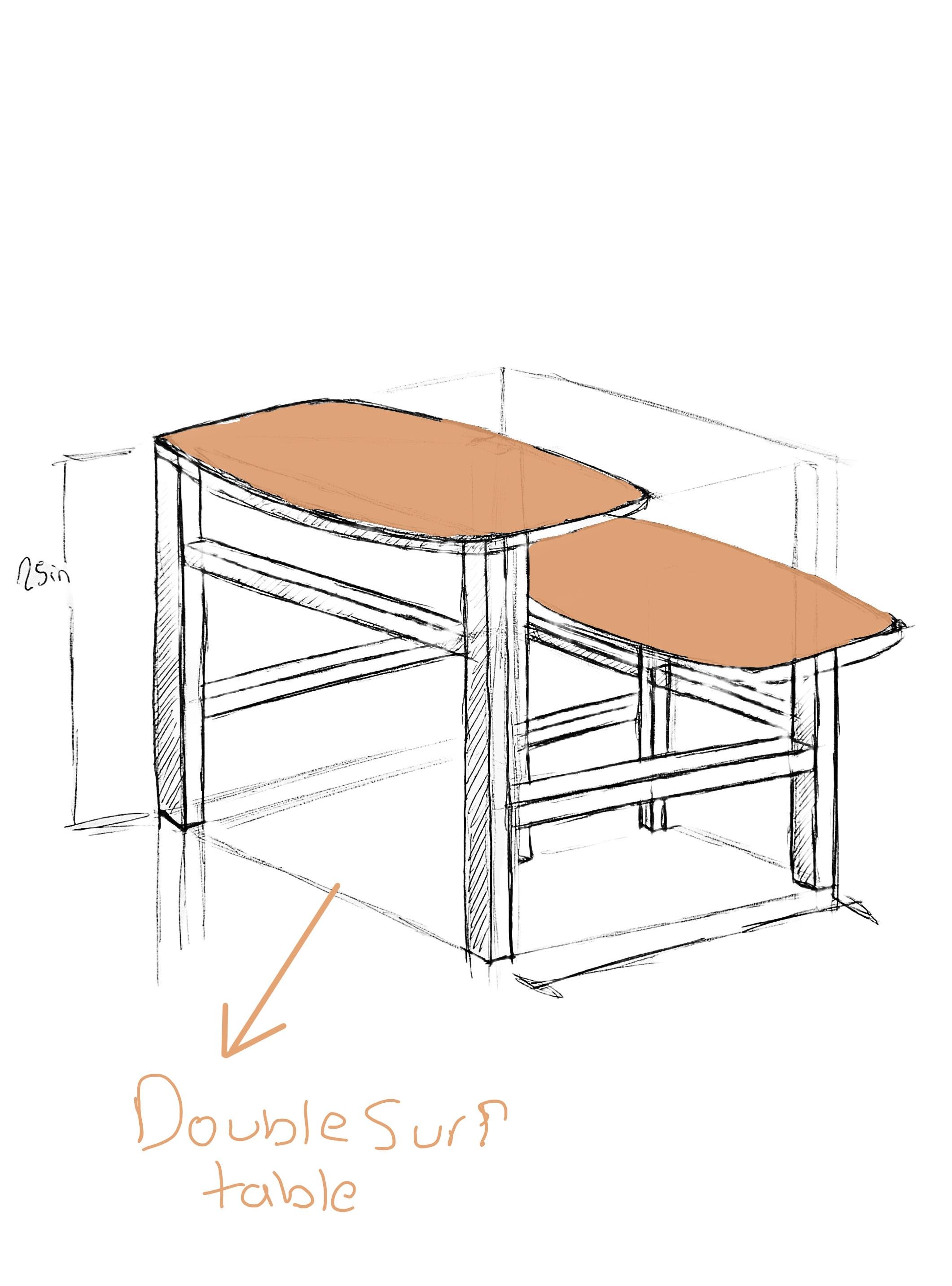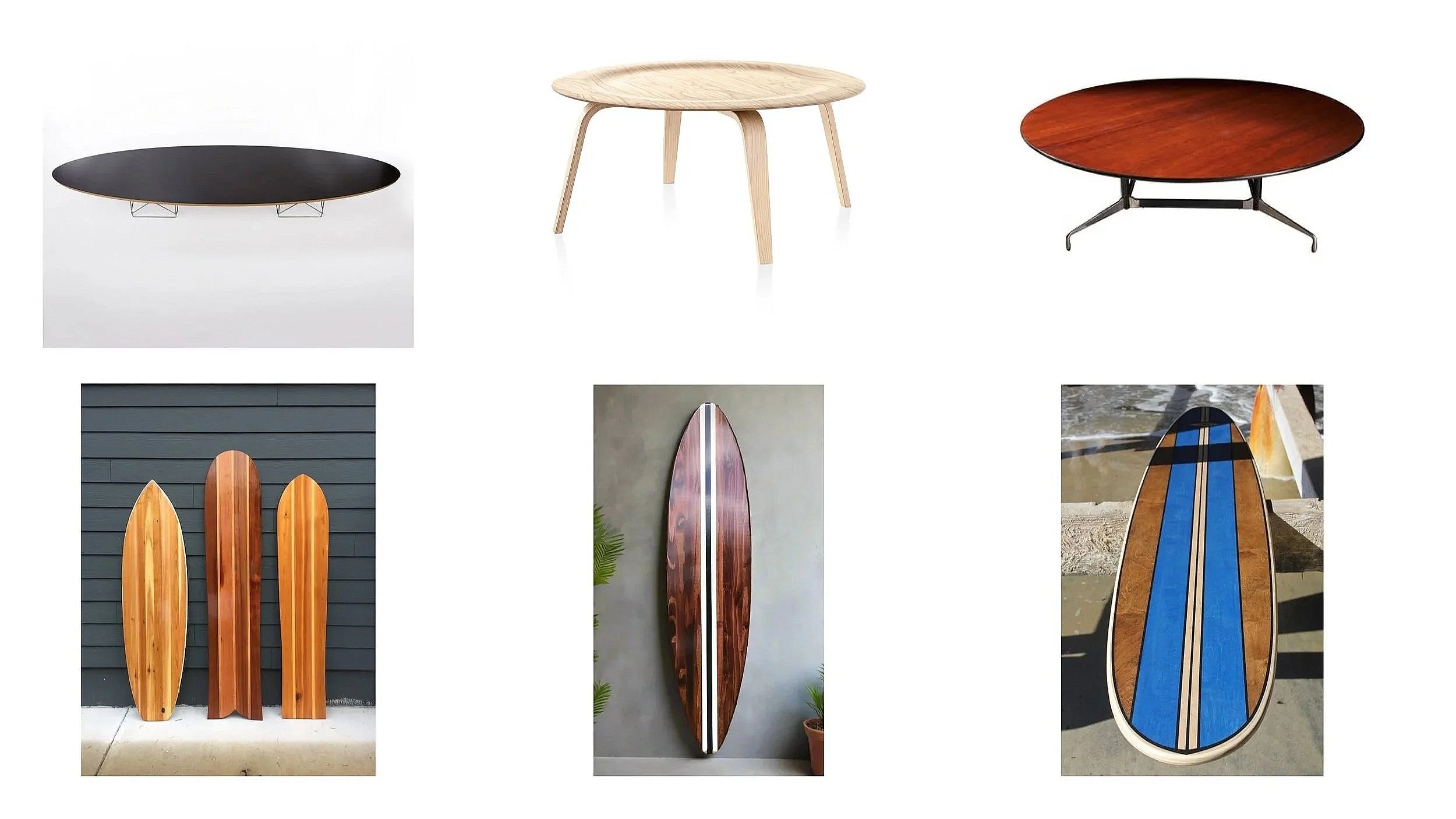 The design was heavily influenced by the Eames table and the sleek, aerodynamic silhouettes of surfboards.